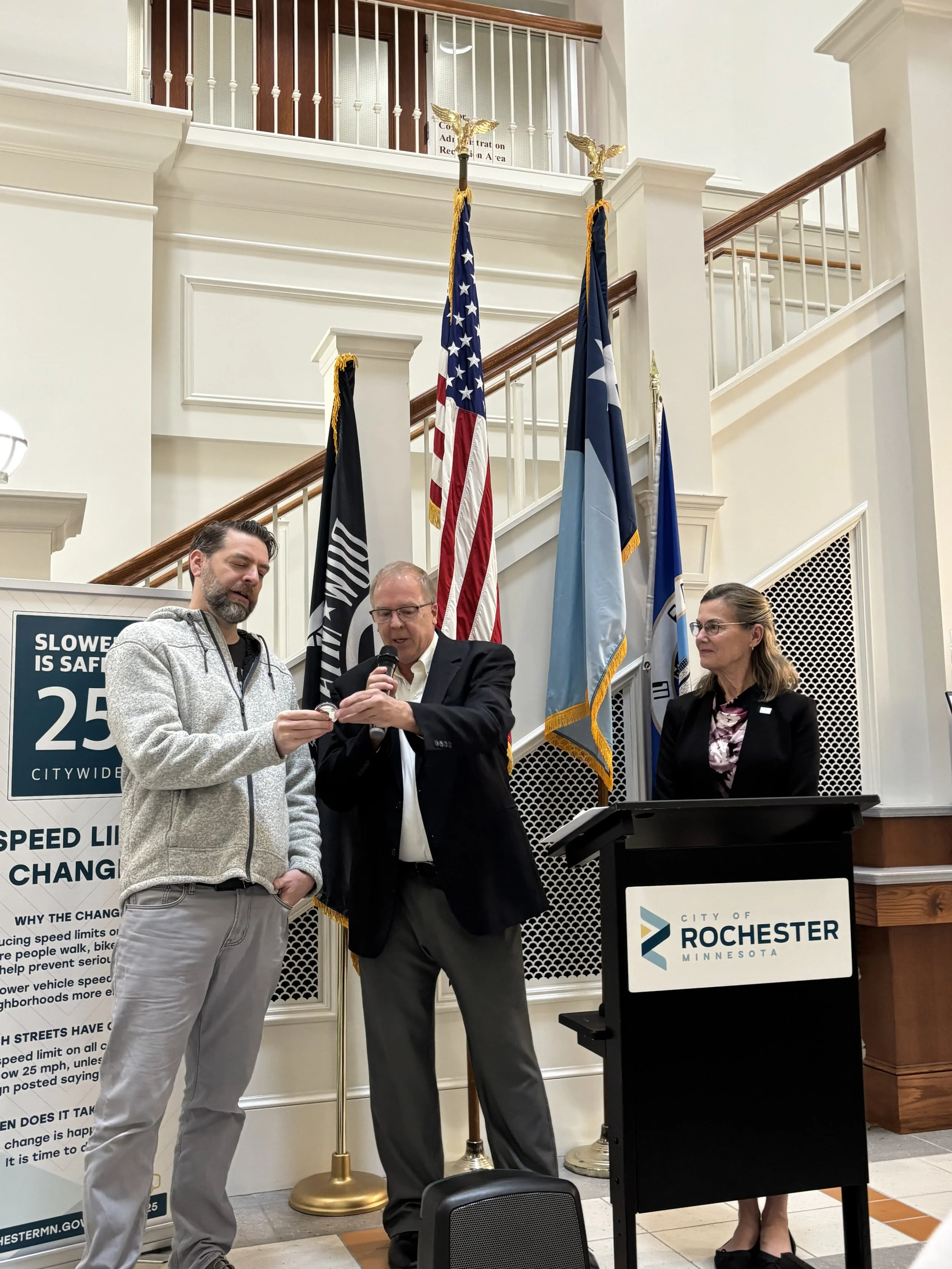 Eric Berg receiving his $300 check from Rochesterfest Executive Director, Randy Stocker. Mayor Kim Norton is getting ready to purchase her button.